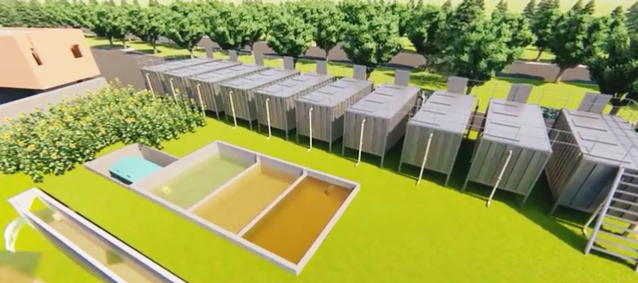 集裝箱式養(yǎng)殖系統(tǒng)采用 20 呎定制化“集裝箱”,尺寸是 6.1 米 *2.4 米 *2.8 米,養(yǎng)殖水體 25 立方米,占地面積為 15 平方米 ,配有納米增氧管(增氧)、出魚(yú)口(收魚(yú))、集污槽(排污)、天窗(觀(guān)察投喂飼料)、固液分離器(尾水處理)等功能構(gòu)件。
